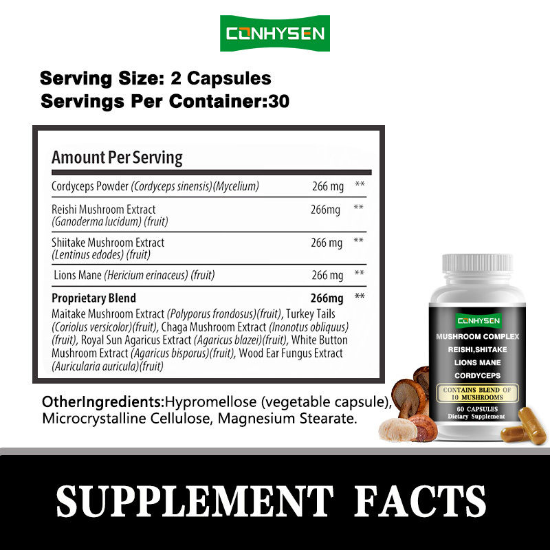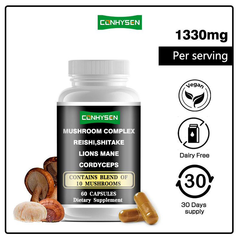 Κάψουλες Συμπλέγματος Μανιταριών Private Label Ενισχύουν την Ανοσία, την Υγεία του Εντέρου, την Ενέργεια 10 Μανιτάρια