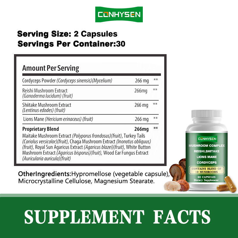 Τα μανιτάρια είναι συμπληρώματα διατροφής που έχουν επιστημονική διαμόρφωση και επεξεργασία από διάφορα λειτουργικά μανιτάρια, όπως το Reishi, το Shiitake, το μυκήλιο Lingzhi και το Tremella.Περιέχει πολύτιμα συστατικά όπως τα πολυσακχαρίδια., τα τερπενοειδή, την εργοθειονίνη και τα ορυκτά από αυτά τα μανιτάρια, που λειτουργούν ως φυσικό αποθετήριο υγείας που παρέχει πολυδιάστατη προστασία της υγείας για το ανθρώπινο σώμα.