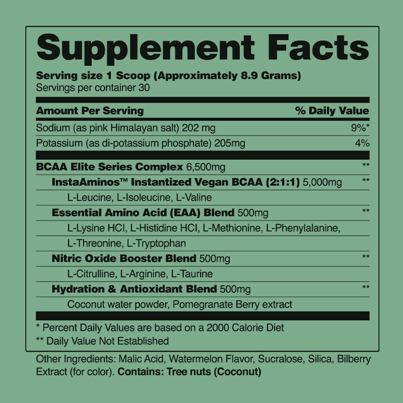 Συστατικά: Νάτριο, Κάλιο, Σύμπλεγμα BCAA Elite Series, Στιγμιαία Vegan BCAA, Μείγμα Απαραίτητων Αμινοξέων, Μείγμα Ενισχυτή Μονοξειδίου του Αζώτου, Μείγμα Ενυδάτωσης & Αντιοξειδωτικών