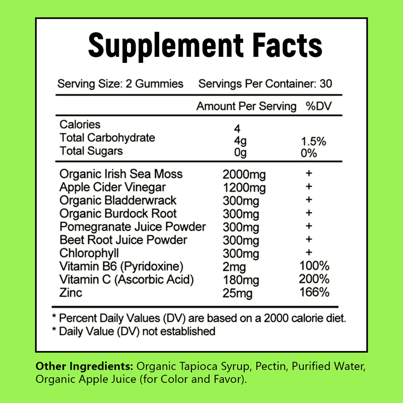 Βιολογικό Ιρλανδικό Θάλασσιο Μουσό, Βιολογικό Βυζώριο, Βιολογική ρίζα βούρδου, Ξύδι μήλου, Ρουφή χυμού ροδιού, Ρουφή χυμού ρίζας τεύτλων, Ψευδάργυρος, Βιταμίνη Β6, Βιταμίνη C, Χλωροφύλλη