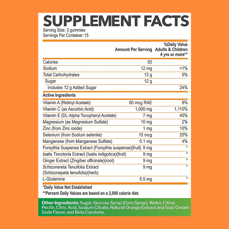 Βιταμίνη C, Βιταμίνη Α, Βιταμίνη Ε, Ψευδάργυρος, Μαγνήσιο, Σελήνιο, Μαγγάνιο, Εκχύλισμα Τζίντζερ, Εκχύλισμα Forsythia Suspensa, Εκχύλισμα Isatis Tincotoria, Εκχύλισμα Schizonereta Tenuifolia, L-Γλουταμίνη