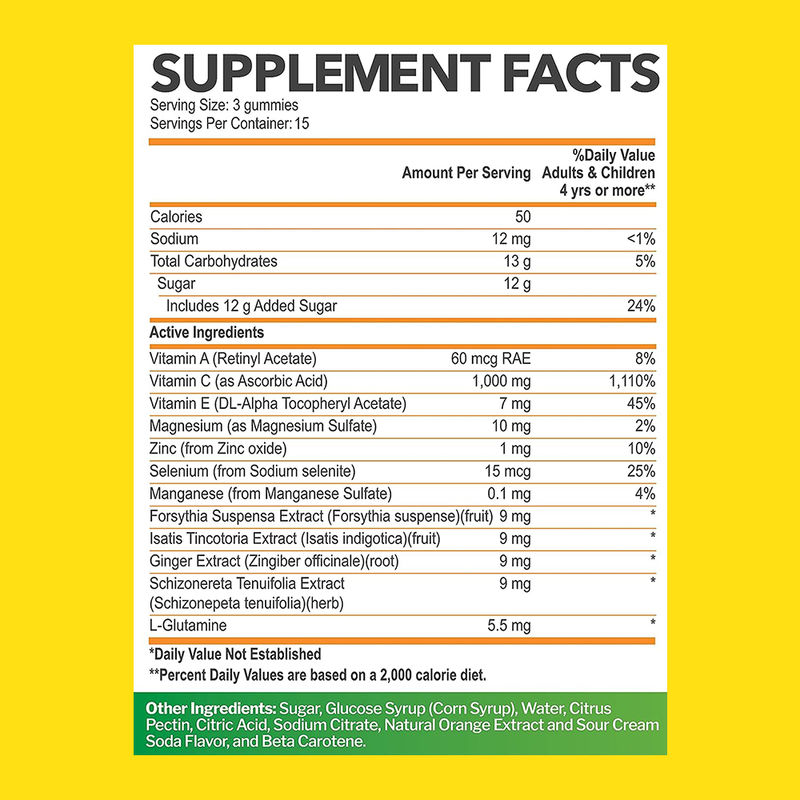 Βιταμίνη C, Βιταμίνη Α, Βιταμίνη Ε, Ζήνκος, Μαγνήσιο, Σελένιο, Μαγγάνιο, Εκχύλισμα Ζαχαριούλης, Εκχύλισμα Forsythia Suspensa, Εκχύλισμα Isatis Tincotoria, Εκχύλισμα Schizonereta Tenuifolia, L- γλουταμίνη