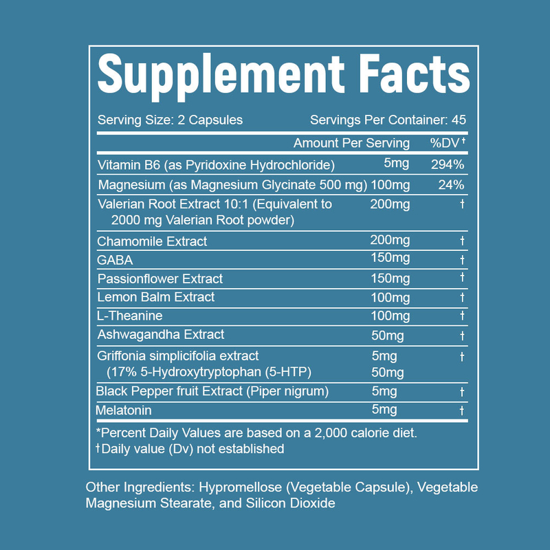 Βιταμίνη Β6, μαγνήσιο, εκχύλισμα ρίζας βαλεριανής, εκχύλισμα χαμομηλιού, GABA, εκχύλισμα πασιονέλλους, εκχύλισμα λεμονιού, L-θεανίνη, εκχύλισμα ασγουάνθας, εκχύλισμα Griffonia simplicifolia,Εκχύλισμα φρούτων μαύρης πιπεριάς, μελατονίνη